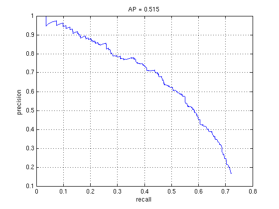 The feature representation used for image patches makes a significant difference in detection rate. The default example (simply the image crops themselves) performed terribly. Switching the internal representation to SIFT yielded accuracies of about 37%, using the default parameters of the base implementation (1000 positive examples, linear SVM, detector step size of 4 and scale factor of 1.5, without hard negative mining)
