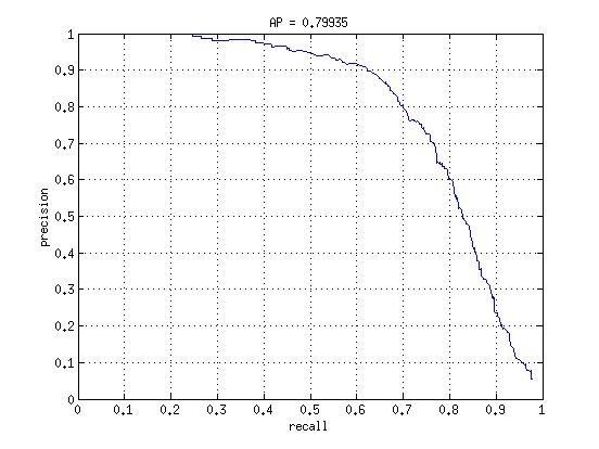 The radial kernel with no hard negatives looks very similar to the linear with hard negatives, except it lacks the perfectly flat line at the star, which makes sense because random negatives can't give it a perfect sense of what a face is at any significant threshold. Once the hard negatives are mined, we see the same phenomenon as we did in linear, where the precision stays almost flat at 1, but for a much larger recall now before finally sloping down again. As expected, this kernel allows us to better classify face data which does not likely fall in a linear region. Chances are that in some high dimensional space it just occupies a region which is surrounded on all sides by nonfaces.