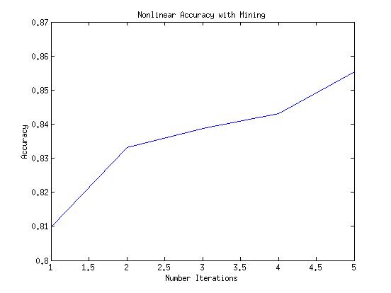 After having done a few tests to find the optimal SVM parameters, I gage the performance of the detector with the linear and nonlinear features with varying amounts of hard negative mining. Below you can see the performance of both the linear and radial kernel as functions of iterations.