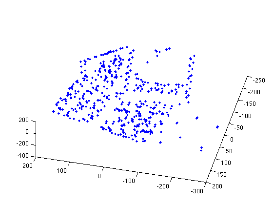 We know that a camera projection matrix for each frame projects the same 3-space coordinates into two image space coordinates in each frame for each feature. Using the knowledge we can aggregate all of our information into a large matrix, and attempt to factorize the matrix into a projection matrix (all frames matrices together in an organized fashion) and the actual 3 space coordinates. (Note due to the factoring there is an additional matrix between them) While these matrices are not the correct dimension due to noise, we can extract the 3 first columns of each to retain the most important data. Finally, we impose the restriction that our camera's coordinate system are orthonormal, to remove the affine ambiguity. (This is a very hand wavy description of how this process works, to get a general idea of how it works. See the papers for details). Here are the results. The first set of images depict 3-space plots of the featured points. The next set of images shows a reconstructed and texuture mapped mesh, along with the camera path, and direction.