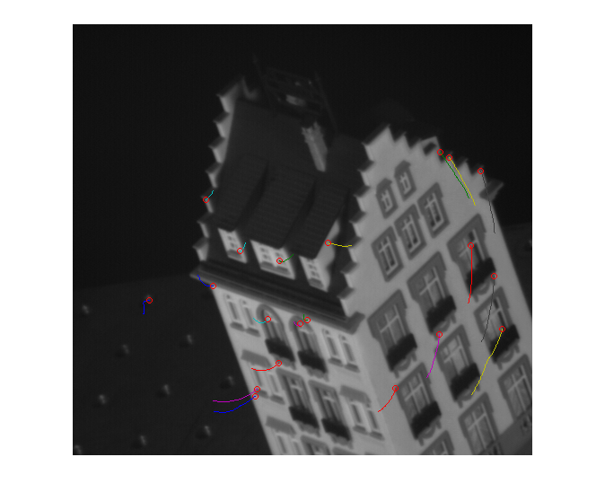 As seen in the images, most of the points remain in the same relative location on the structure. The motion of the camera (slightly moving down and to the left while rotating so that the building goes from being at a tilt to standing vertically) causes the points in the center of the image on the building to make small movements, while the points nearer to the edges of the building make larger movements. Most movements appear to be some sort of circular arc. The exception is the point that was on some sort of ground corner in the first frame (see the lower left of the image) and is improperly tracked. This point moves erratically, in a different direction from the others (it moves counterclockwise, while the others move clockwise). It is probable that this occured because the movement of the background was much greater than the movement of the building.