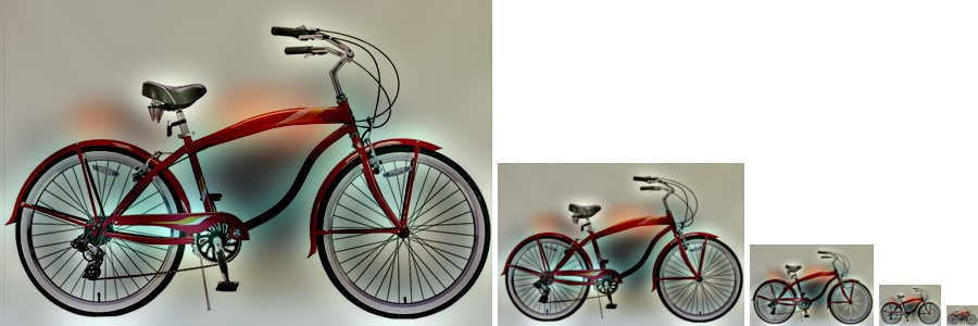 The above hybrid images use the default cutoff frequency of 7. But tuning the cutoff frequency could render different result. For example, in the next example, the first set of images is generated with the cutoff frequency of 7, and the next set of images is generated with cutoff frequency 15 for low frequency and cut off frequency 0 for high frequency. In this case, the motorcycle image is more blurred with the altered cutoff frequency