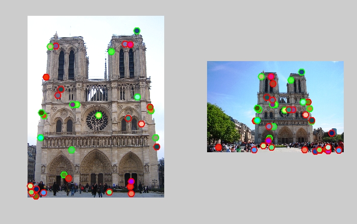 As is evident, switching to the SIFT-like descriptor yields approximately a 25% increase in correct matches. However, even the SIFT-like descriptor has difficulty with large changes in scale, as evidenced by this next image pair.
