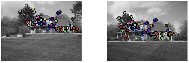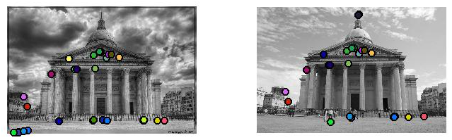 The pictures above shows matching points for both color and grey pictures. For this example, I chose top 100 confident ones from all matching points. And there are 92 good matches and 8 bad matches. Although it is not a perfect result, the matching points can actually plot the outline structure and some special area int the figure(like the circle in the middle).