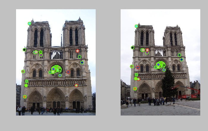 The image of Sacre Coeur worked very well. The images were from similar perspectives, so many of the interest points and associated gradients would be similar. Almost all the matches seem to be correct.