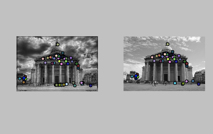 With the Pantheon in Paris, I again got great results. The distinctive interest points on the pediment of the building provided lots of easy, correct matches. Additionally, both images contained a view of a building to the left of the Pantheon. The feature matcher was able to match elements of this building as well, despite the building having few corners / interest points.