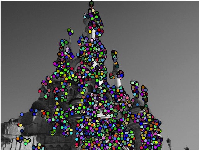 First we use the Harris corner detector (Algorithm 4.1 in Szeliski) to detect the interest points in the images. To compute the horizontal and vertical derivatives of the image, we convolve the original image with two vectors [-2 -1 0 1 2] and [-2 -1 0 1 2]T. The non-maximum suppression is implemented by using the COLFILT function: after we've thresholded (threashold = 0.01) the cornerness score, COLFILT can apply MAX function on each window of the image so that we can get local maximum conrness on each sliding window.