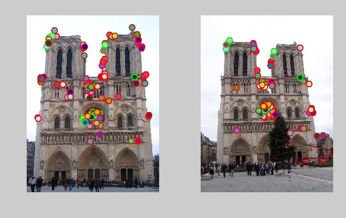 Unfortunately, for reasons unknown, this implementation did not produce good results. On the Notre Dame example, onlly 17 of the top 100 points matched properly. Despite speaking with several teaching assistants and the professor, neither the cause nor a good solution ever became apparent despite change such as reimplementation of the code for matching and throwing out key points that were very similar to others in the same image (and thus may easily be matched improperly).