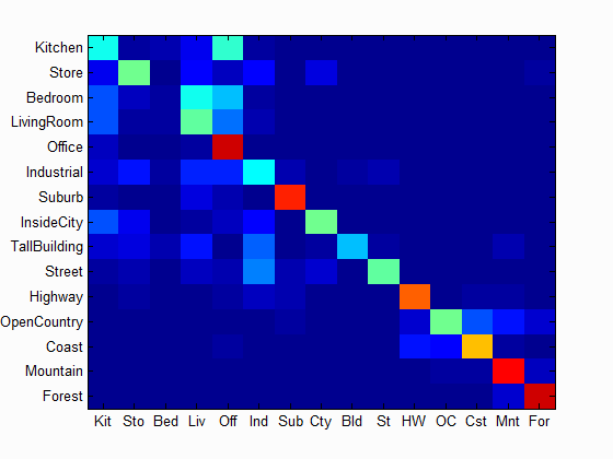 The first step in building the classifier is to actually make the SVMs; there were 15 linear SVMs created, using vl_svmtrain. Each SVM was trained as a one-vs-all classifier for a specific category. For example, the 'kitchen' SVM was trained to recognize images as either 'kitchen' or 'not kitchen'. It should be noted that the only free parameter in svm_classify.m is the LAMBDA value that vl_svmtrain takes as input. I found the LAMBDA value that created the highest accuracy results was 0.001. I was getting a range from 0.49 to 0.66 in accuracy and an average of 0.57 with a lambda of 0.01, but when I switched to 0.001 my average accuracy jumped to 0.66.