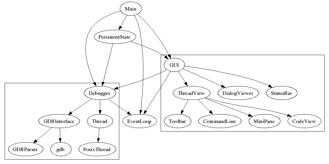 - GDBInterface: the GDB specific code (knows how to 'speak' GDB)