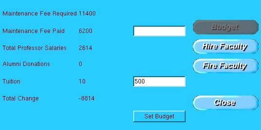 With this window, you can balance the different parts of your budget as well as hire and fire professors. The Budget section displays everything you pay and earn, and shows you the Total Change at the bottom of the list on the left. When you are done with your budget and hiring changes, click the Close button on the bottom right. Balance your budget carefully because you have bad credit and no banks will lend you money, so if you go into debt, your school will go down the drain.