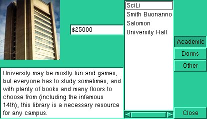 To build a university, the player will be given the option to purchase building contracts to build dorms, libraries, greens, lecture halls, offices, dining halls, frat houses, athletic facilities, and campus bars. Because this is the Brown University version, these buildings will look similar to ones on the Brown University campus. The player can place these buildings (which will be pre-made so the user does not need to build one) anywhere he would like. Students will begin enrolling in the college once the user “opens” the university to the public.