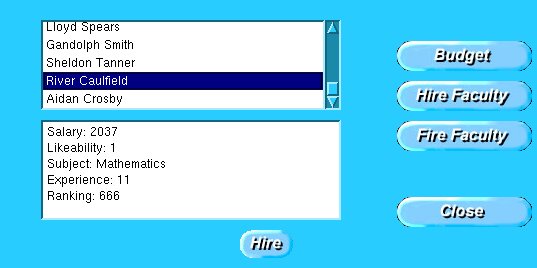 Your students won't learn much in college if they don't have professors, so you are in charge of hiring (and firing) them. To do this, click on the Hire Faculty button from the Budget Window. That will give you this interface for selecting professors:
