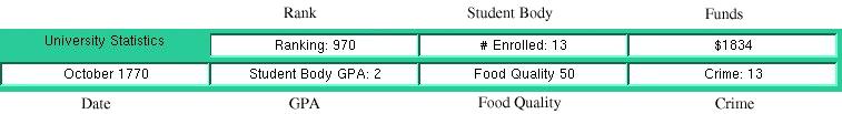 4.5 StatisticsYour goal as president is to create a successful and prestigious institution, but how do you know how good your school is? Thats where the University Statistics come in handy. At the bottom left corner of the main window, you can see all the relevant information about the current state of your school: