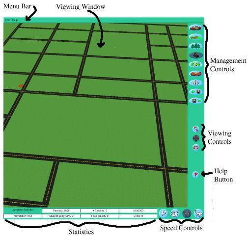 4.2 Workspace (GUI)The window that pops up when you open the game is your workspace, containing all the tools you will need to develop and run a successful school. The main window in the middle of the screen is the Viewing Window, your view of the university. This is where you see the roads you begin with, all the buildings you build, beautiful birds, and even a few students. To the right is a panel of buttons containing all the Management Controls used to build and control elements of your univeristy. The bottom three buttons are your Viewing Controls and are used to change the view you have of your campus. Just below those is a help button to remind you of the functions of all the buttons. Above the Viewing Window is the Menu Bar with options to begin and end games. On the bottom left are the Statistics, boxes that show current statistics for your university, and on the bottom right is the panel of Speed Control buttons which you use to control the speed of passing time. While you are viewing your campus, the cursor is a little red square, but it will change when you begin to build things.