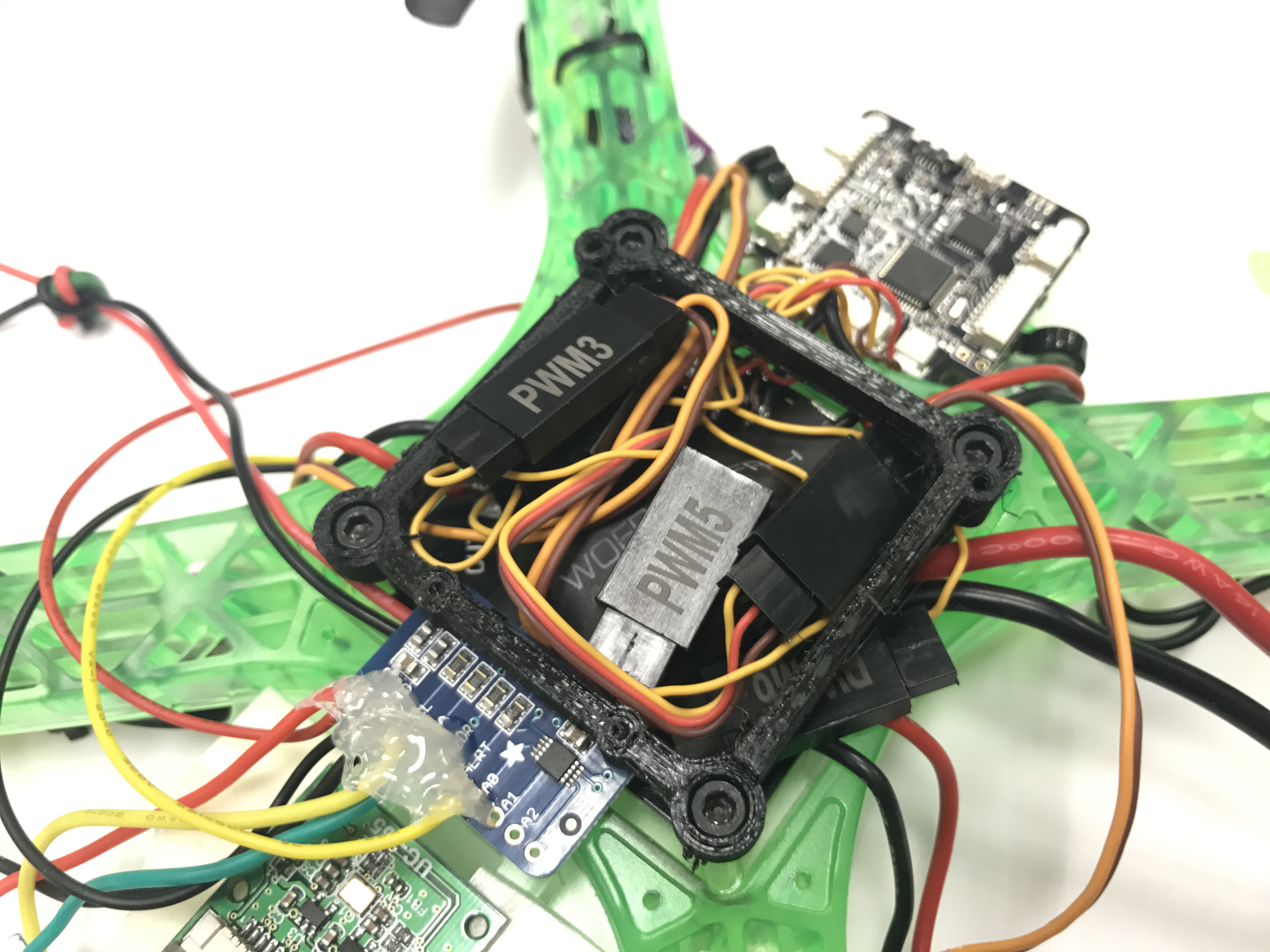 And finally use the short M3 bolts to screw the pimount onto the standoffs, holding the mess of wires in place. The ADC should be toward the back of the drone (the end with the camera), and the two small elevated holes should be towards the front of the drone.