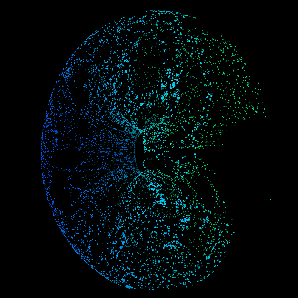 I generated a 3D simulation by mapping the world to a torus. This is done by drawing a cube for every cell in the world, and positioning them based on their texture coordinates. The mapping is rather simple and can be found on Wikipedia. Because of the large number of cubes, the simulation runs rather slowly (~13fps at 1912x1080). Finally, I apply a warp post-process shader to move things around. Below is a screenshot of my visualization.