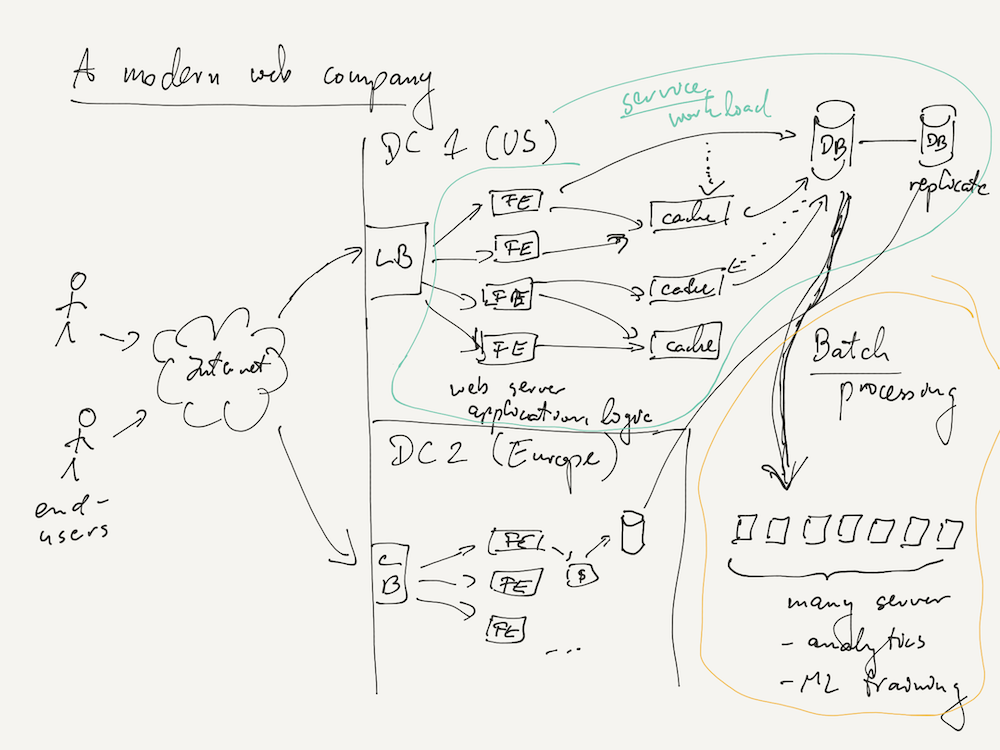 Modern web services can have millions of users, and the companies that operate them run serious distributed systems infrastructure to support these services. Below picture shows a simplified view of the way such infrastructure is typically structured.