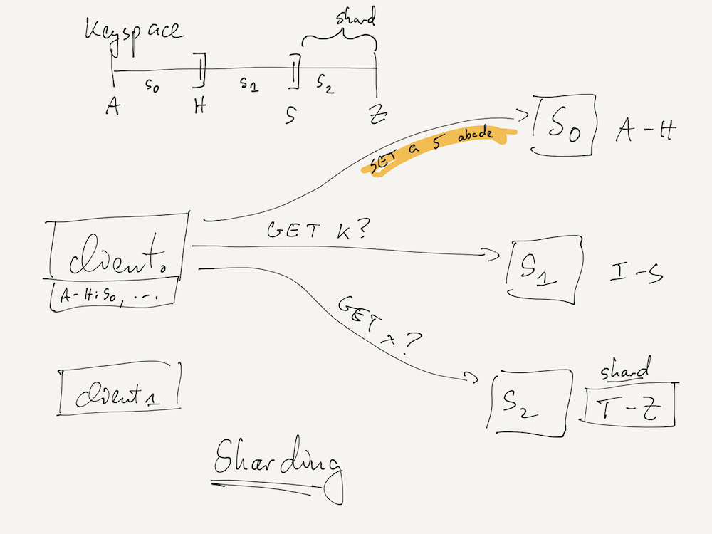 To make this sharding work, the client must know which server is responsible for which range of keys. This assignment (the “sharding function”) is either hard-coded into the client, or part of a configuration it dynamically obtains from a coordinator system (in the Distributed Store project, this coordinator is called “shardmaster”).
