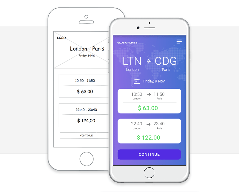 If wireframes are the skeleton of your app design, then mockups can be thought of as the skin. Mockups are more high-fidelity and display all the visual themes of the app. The purpose of the mockup is to show what fonts will be used, how colors will be placed, and what types of images will be used. Mockups are a static map of your app (so like a wireframe, they are not clickable).