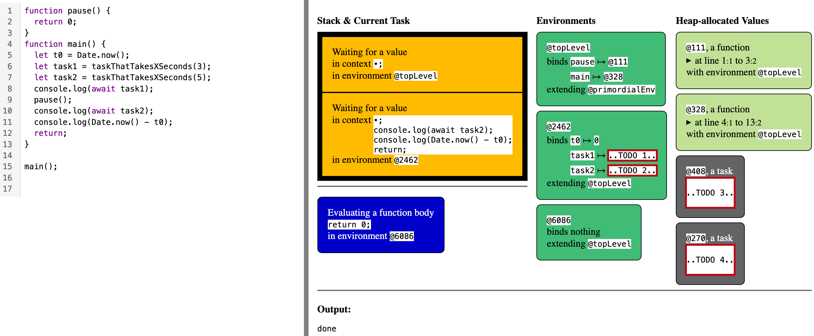 We want you to demonstrate your understanding of async/await by drawing the stack + heap configurations, in the style of the Stacker, for the two JavaScript programs. Below are templates for the stacker at the point of calling pause for each program above. You need to fill in each of the “Todo”s.
