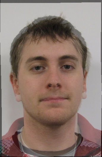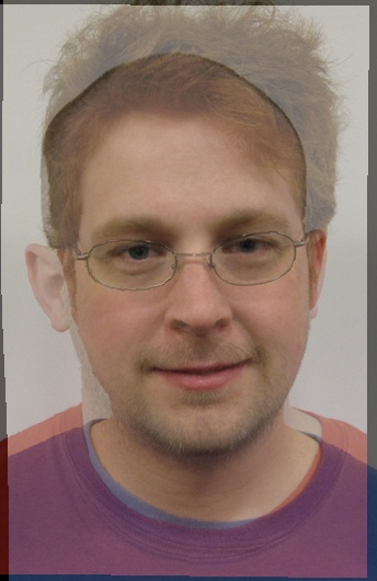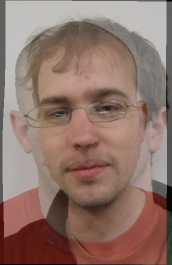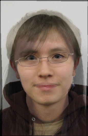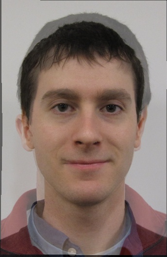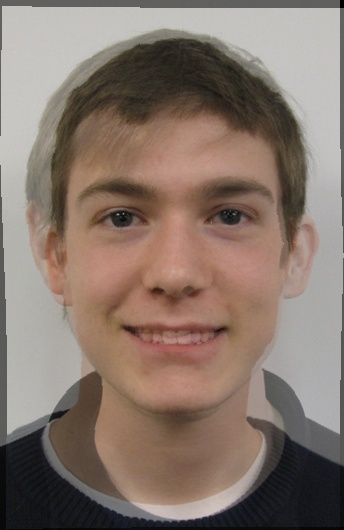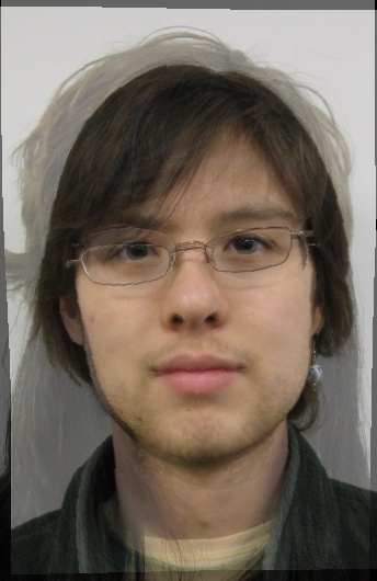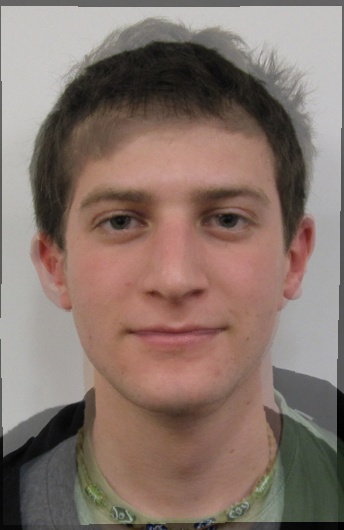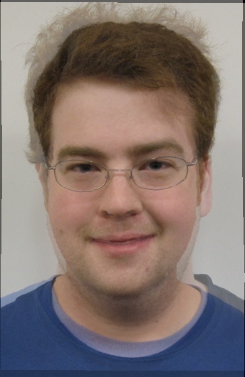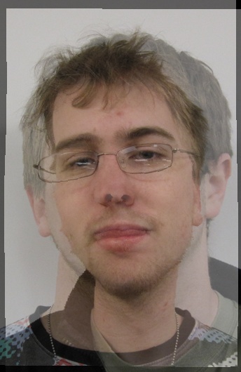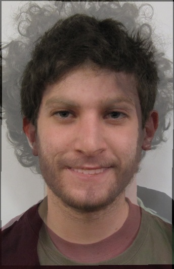 The algorithm is suprisingly simple. The input consists of two images of faces and the corresponding points, ie left eye in picture A mapped to left eye in picture B. First we find the vector between every pair of corresponding points. We would like to go from the output pixel backwards to the original image to grab the pixel color, therefore to get from a pixel in a warped image to the original we just use (location - offset) where the offset is some distance along the shift vector. This distance is determined by a warpratio and is an input into the morph function. For example if the warp ratio is 0.2, one image would have an offset of (0.2*shift_vector), the other would meet it by traveling (0.8*-shift_vector). This brings both corresponding points to the same location on the warped images. This allows us to find the offset for a few pixels but we need to find the offset for the rest too. We would like the offsets to not vary to dramatically from pixel to pixel. To do this we simply poisson fill the offsets across the images, diffusing the known value at a few points throughout. We can then get the value of a pixel in the warped image by finding the pixel at (location-offset) in the original image. We do this for both faces, and then use a crossdissolve to blend them into each other. The ratio of the crossdissolve is also an input into the warp.