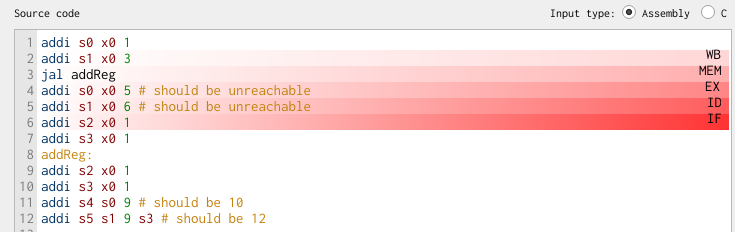 This is where different views in Ripes are helpful. In the processor view, we see that the output of the branch/jump gate logic in the Mem stage is high only when the jal instruction reaches the Mem stage: