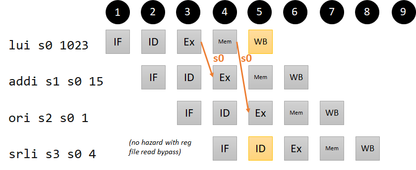 srli s3 s0 4 # s3 = 261888 (0x0003ff00); no dependency (with read bypass)