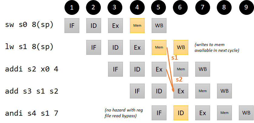 lw s1 8(sp) # s1 = 11; no dependency; memory updates immediately in mem stage