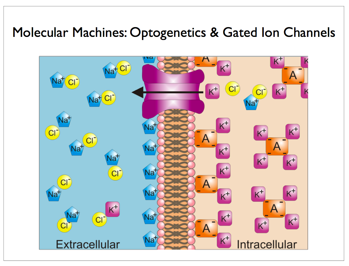 (d) Biological organisms routinely generate, encode, transcode, transmit and decode electrical and chemical signals. The machinery for doing so is now being adapted to serve diverse technological purposes from sequencing DNA as in the case of third-generation sequencing technologies using nanopores [47] or optogenetics in which naturally occurring light-gated ion channels originally used to excite or inhibit neural activity [8, 51] are now being developed as voltage sensors capable of resolving action potentials [7]. Methods for encoding digital information in the form of sequences of nucleotides in strands of DNA have been around for some time [16] and now we are seeing new ideas about using molecular machinery to measure proxies for electrical activity and store the resulting information on DNA [32, 53]. We’ll explore these and other related applications in more depth later in the talk.