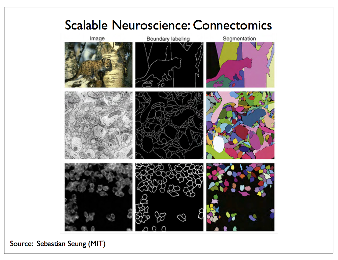 As long as we have had microscopes powerful enough to resolve individual neurons, scientists have been refining methods for imaging neural tissues using specialized preparations that make neuron cell bodies stand out and utilizing ever more powerful devices, with scanning electron microscopes currently now common in academic labs. Once the tissue is prepared and an image taken, it is generally the task of a trained neurophysiologist to interpret the image and determine where one cell leaves off and another one begins. Having skilled humans in the loop, whether working with the tissue samples or interpreting images doesn’t scale, and so research labs led by Winfried Denk at Max Planck and Sebastian Seung at MIT are developing robotic devices for handling the tissue and interpreting the results of imaging [5, 29].