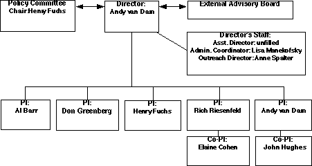As indicated in the figure below, the Center is governed by a Director, who functions as Chief Executive Officer. At the end of Year 5, the directorship transferred from the founding Director, Don Greenberg to Andries van Dam, the present Director. The Director executes policy devised by a Policy Committee, in accordance with the Center's long-term strategic plan. The Policy Committee also elects the Director. During the Center's initial six years the Director was supported by a Chief Financial Officer and a Chief Operations Officer. The CFO position remains intact and is held by Rich Riesenfeld. The COO position has been subsumed by the Director's Staff which consists of the Assistant Director (currently an unfilled position), the Outreach Director, and the Administrative Coordinator. The Director is advised by an External Advisory Group.