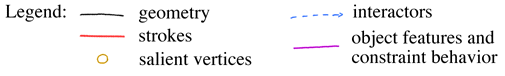 Object creation requires placement of the object in the scene. We base object placement on four rules: first, geometry is placed so that its salient features project onto their corresponding gesture strokes in the film plane; second, new objects are instantiated in contact with an existing object when possible; third, certain invariants of junctions in line drawings [9] that indicate the placement or dimension of geometry are exploited; and fourth, CSG subtraction is inferred automatically from the direction of gesture strokes.