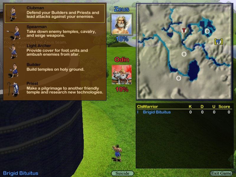 Gods and Warriors is a real-time strategy game where each player controls a single unit, blending Age of Empires with Battlefield 1942. (The blending is not just in gameplay; you can see the Age of Empires artwork used in this in-house prototype!)